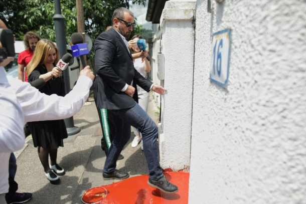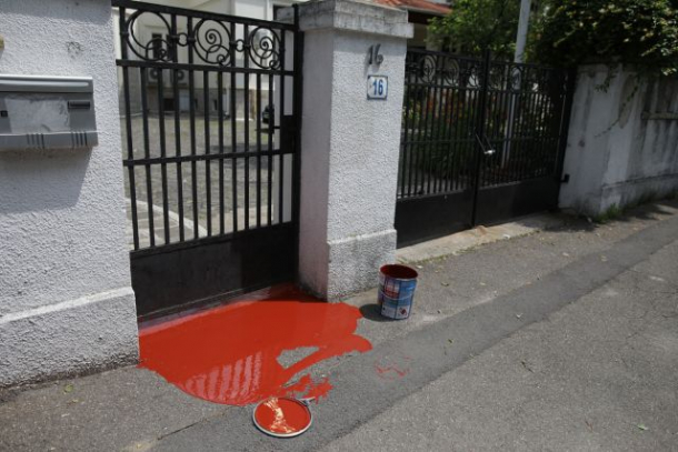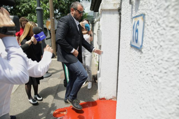 Protest inedit la Secția specială, chiar în ziua audierii șefului DNA Constanța. Intrarea în instituție se face cu dificultate, după ce protestatarii au vărsat vopsea roșie pe jos (FOTO)