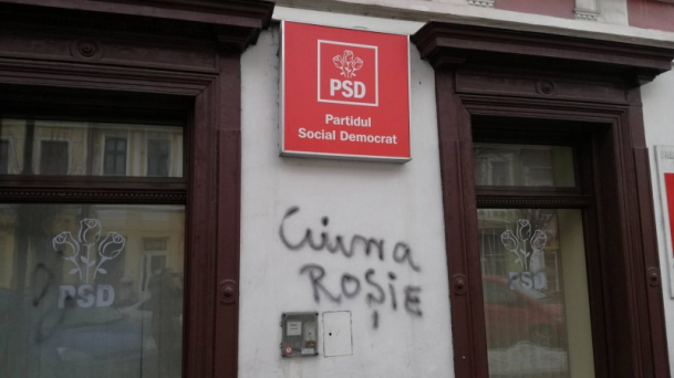 Sediul PSD din Bistrița, VANDALIZAT! Azi-noapte protestatarii au scris „CIUMA ROȘIE” pe perete (FOTO)