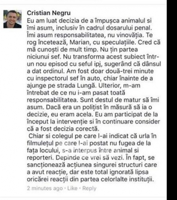 De altfel, Cristian Negru a recunoscut într-o postare avută pe Facebook că el este cel responsabil de decizia de împușcare a animalului și își va asuma această hotărâre și în cadrul anchetei.