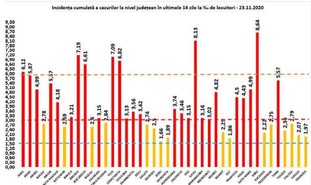 Incidențe de peste 6 sunt în județele Alba (6,12), București (6,61) și Constanța (6,82).