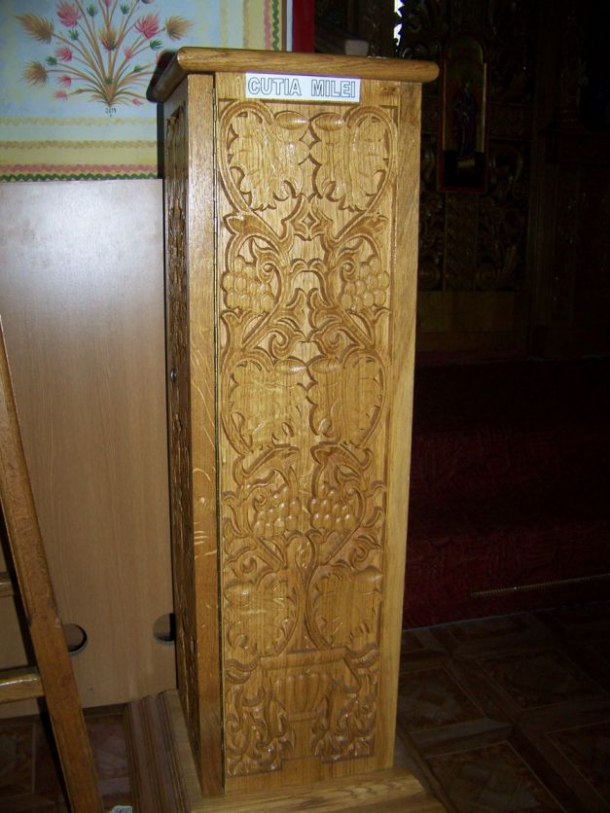 Impozanta cutie a milei este din lemn, are 1 metru şi jumătate înălţime şi este încrustată cu motive florale, fiind realizată pe comandă la un atelier specializat.