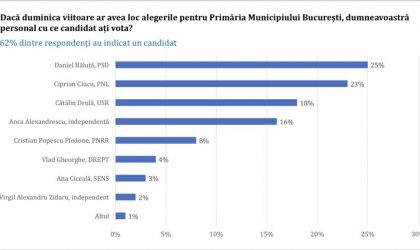 În ceea ce privește preferințele electorale, Daniel Băluță (PSD) conduce în intențiile de vot pentru Primăria Municipiului București, cu 25%, urmat de Ciprian Ciucu (PNL) – 23%, Cătălin Drulă (USR) – 18%, și Anca Alexandrescu (independentă) – 16%.