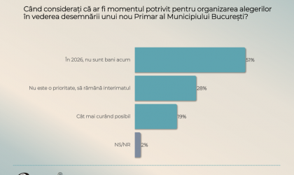 Rezultatele sondajului arată că mai mult de jumătate dintre bucureșteni nu consideră o chestiune urgentă alegerea primarului. Întrebați când consideră că ar fi cel mai potrivit moment pentru organizarea alegerilor, 51% dintre respondenți au ales varianta de răspuns: „În 2026, nu sunt bani acum”. 28% dintre votanți cred că „nu este o prioritate, să rămână interimarul”, în timp ce doar 19% sunt de părere că alegerile ar trebui să se organizeze cât mai curând posibil.