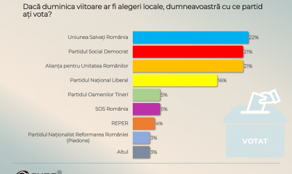 Topul preferințelor votanților se schimbă când vine vorba de votul pentru consilii. Primul clasat este USR-ul (22%), urmat îndeaproape de PSD și AUR, care sunt la egalitate cu 21% dintre voturi. Pe PNL ar pune ștampila 16% dintre bucureșteni, iar pe POT și SOS doar 5%.