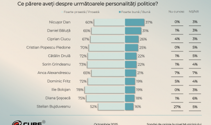 Cât despre favoritul pentru funcția de Primar General al Bucureștiului, Daniel Băluță, 65% dintre bucureșteni au o părere proastă sau foarte proastă. Doar 31% au o părere bună sau foarte bună.