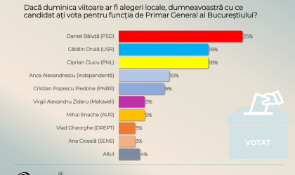 Dacă săptămâna viitoare bucureștenii ar trebui să își aleagă primarul, primul clasat, cu o pondere de 25%, ar fi Daniel Băluță, candidatul PSD. Pe locul al doilea s-ar situa, la egalitate, cu 18%, Cătălin Drulă (USR) și Ciprian Ciucu (PNL).