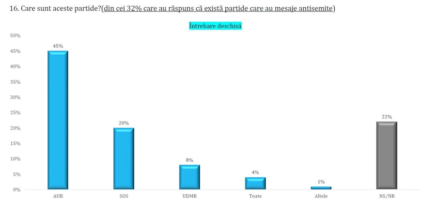 32% dintre români cred că în România sunt partide antisemite, iar cei mai mulți dintre aceștia au indicat AUR (45%) și SOS, partidul Dianei Șoșoacă (20%), urmate de UDMR (8%).