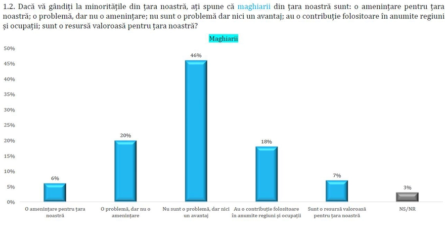 Potrivit unui sondaj Avangarde privind percepția românilor asupra minorităților, 6% dintre cei chestionați declară că maghiarii din țara noastră sunt o amenințare, 20% consideră că sunt o problemă, dar nu o amenințare, 46% spun că nu sunt o problemă dar nici un avantaj, 18% consideră că au o contribuție folositoare în anumite regiuni și ocupații și doar 7% precizează că sunt o resursă valoroasă pentru țara noastră.