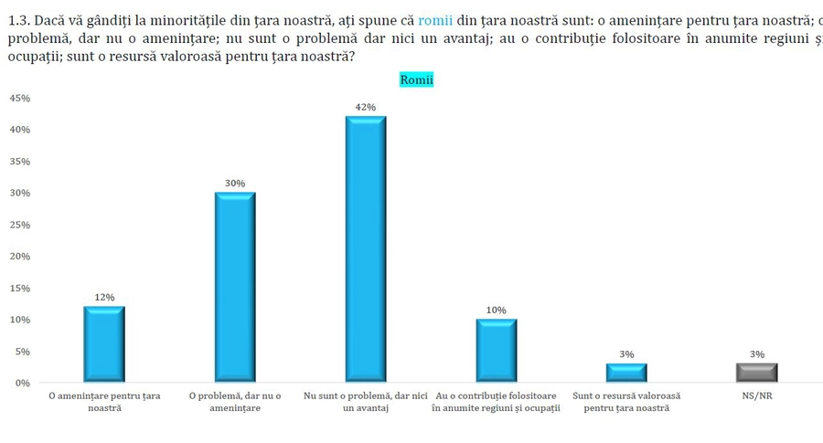 O atitudine mai negativă a românilor se manifestă față de minoritatea romă. Astfel, 12% consideră că romii din țara noastră sunt o amenințare, 30% precizează că sunt o problemă dar nu o amenințare, 42% spun că nu sunt o problemă dar nici un avantaj, 10% declară că au o contribuție folositoare în anumite regiuni și ocupații, în timp ce doar 3% consideră că sunt o resursă valoroasă pentru țara noastră.