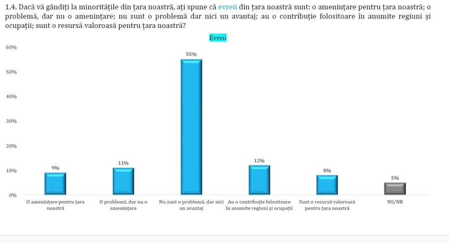 Când vine vorba despre evrei, 9% dintre români spun că sunt o amenințare, 11% declară că sunt o problemă, dar nu o amenințare, 55% consideră că nu sunt o problemă dar nici un avantaj, 12% precizează că au o contribuție folositoare în anumite regiuni și ocupații, iar 8% mai precizează că sunt o resursă valoroasă pentru țara noastră.