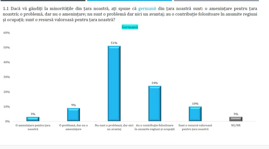 Când vine vorba despre monoritatea germană, doar 3% dintre români spun că germanii sunt o amenințare, 9% că sunt o problemă, dar nu o amenințare, 51% precizează că nu sunt o problemă dar nici un avantaj, 24% consideră că au o contribuție folositoare în anumite regiuni și ocupații, în timp ce 10% consideră că sunt o resursă valoroasă pentru țara noastră.
