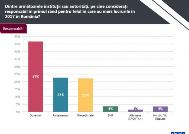 Într-o proporție covârșitoare, românii cred că lucrurile merg într-o direcție greșită (75%), iar responsabilul principal este considerat a fi Guvernul – 47% dintre respondenți indică astfel instituția Executivului.