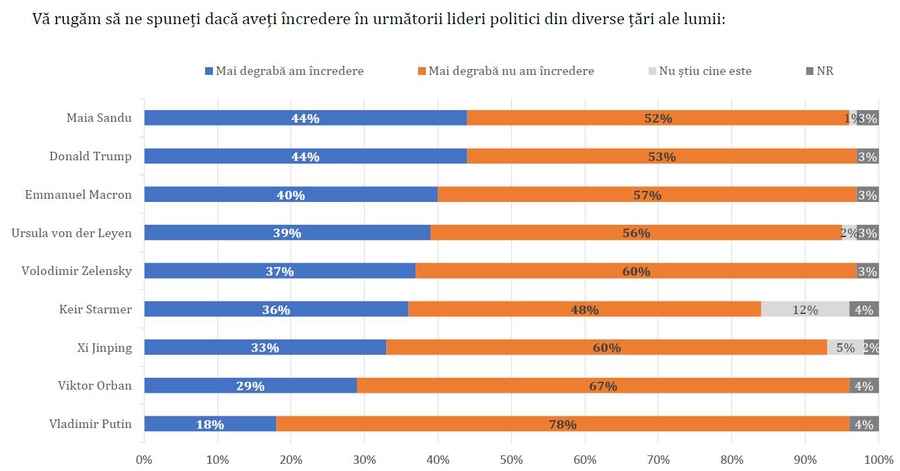 Când vine vorba despre liderii internaționali, românii au cea mai mare încredere în Maia Sandu și în Donald Trump. 44% dintre respondeți spun că mai degrabă au încredere în cei doi lideri. La polul opus se situează premierul ungar Victor Orban și Vladimir Putin. Aceștia se bucură de o încredere de doar 29%, respectiv 18%.