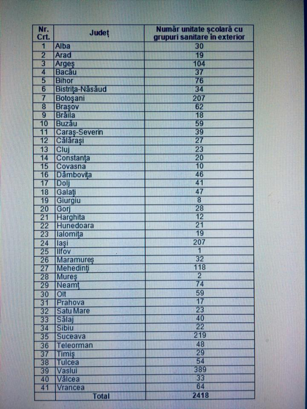 Miercuri s-au sărbătorit 159 de ani de la Unirea Principatelor Române, dar statisticile oficiale plasează România drept o ţară primitivă. Chiar ministrul Educaţiei, Liviu Pop, a prezentat un document care arată cum 2418 şcoli din ţară au încă grupurile sanitare în exterior.