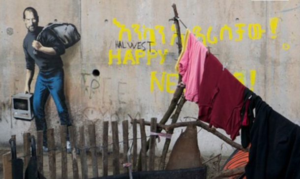 În acest context, artistul britanic Banksy a realizat un portret în graffiti al lui Steve Jobs, cofondatorul companiei Apple, pe un zid din tabăra de refugiaţi din Calais, un oraş în nordul Franţei, pentru a sublinia dramele prin care trec imigranţii din lumea întreagă, informează reuters.