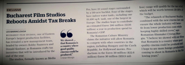 Ministrul Culturii, dna Corina Șuteu, citată de publicația Variety, declară că "inițiativa introducerii sistemului de tax incentives va permite României să concureze cu alte țări din Europa, precum Ungaria sau Cehia în atragerea producțiilor cinematografice internaționale".