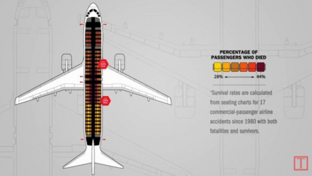 Statistica a fost realizată de către publicația Times și arată că locurile situate în partea din spate a avionului au cele mai mici rate de mortalitate (32%), în comparație de cele din mijloc (39%) și cele din fața aeronavei (38%). Referitor la pozița rândului, locurile din mijloc sunt cele mai sigure, având o fatalitate de 28%.