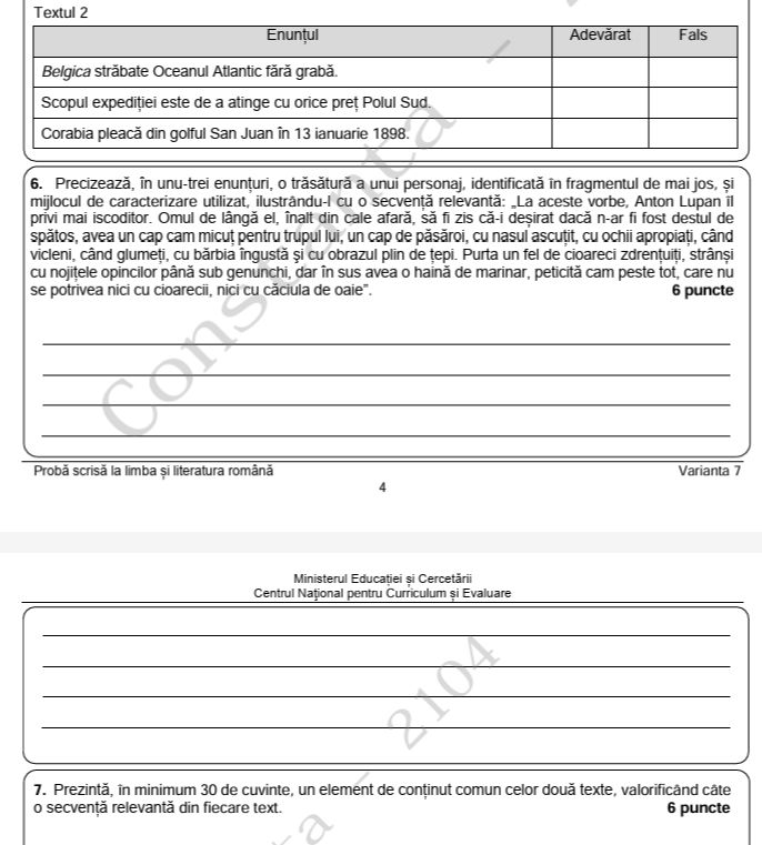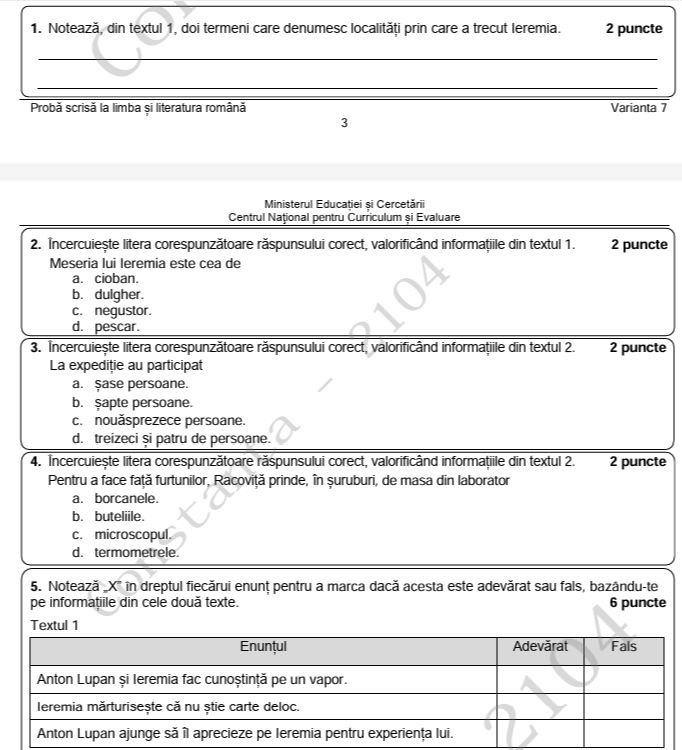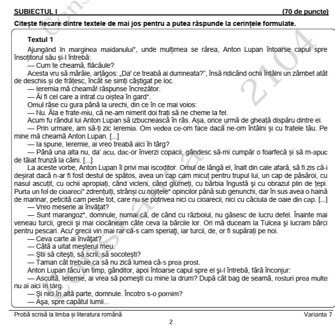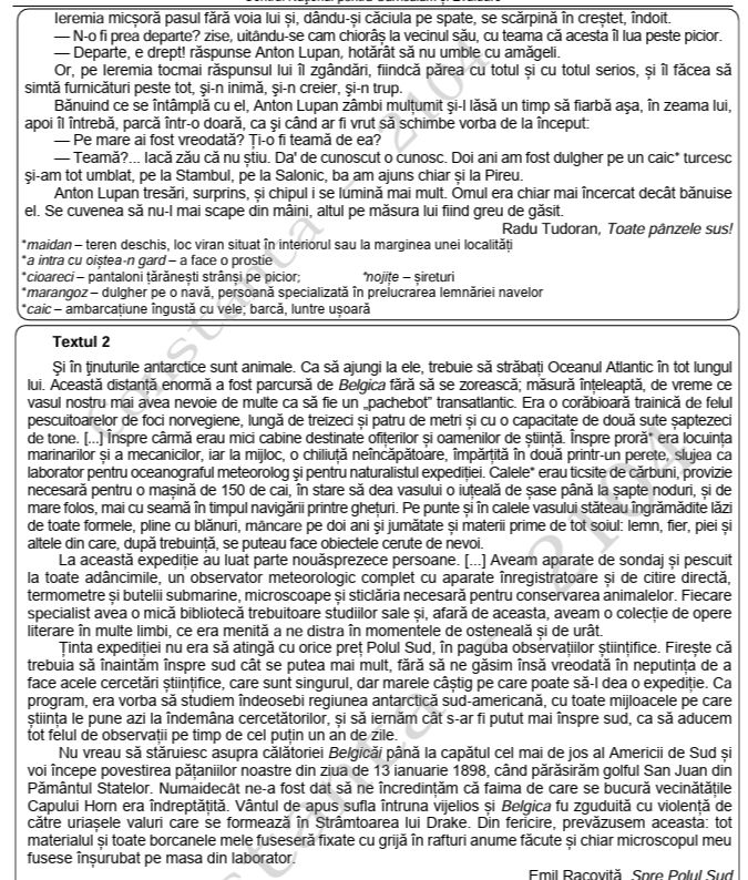 La Subiectul I s-au dat două texte la prima vedere: „Toate pânzele sus”, de Radu Tudoran și „Spre Polul Sud”, de Emil Racoviţă.