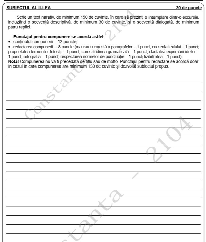La Subiectul II, elevii au avut de alcătuit o compunere narativă despre o întâmplare dintr-o excursie.