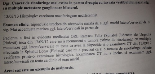 Totul a început în septembrie 2012, când Corina Fulga, din Breaza de Jos, județul Prahova, s-a prezentat la Spitalul Județean din Ploiești cu dureri în zona sinusurilor. Cei de aici, deși i-au făcut și o examinare cu un Computer tomograf la Spitalul Lotus, nu au recunoscut o tumoră extinsă de rinofaringe cu multiple metastaze. După cum se precizeazează în fișa de consult Radioterapeutic a pacientei, “acest caz este un exemplu de malpraxis”.