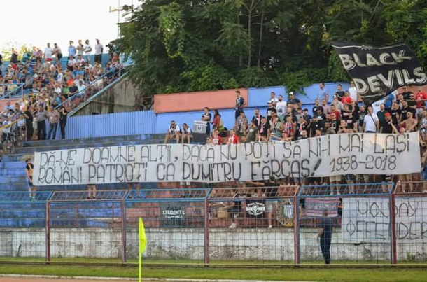 „Dă-ne Doamne alții, dacă nu poți să ni-i mai lași / Români patrioți ca Dumitru Fărcaș! 1938-2018”, scrie pe bannerul fanilor clujeni.