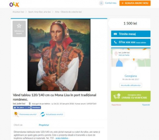 Un tablou cu Mona Lisa îmbrăcată în port tradițional românesc este de vânzare pe site-ul OLX, acesta valorând 1.500 de lei.