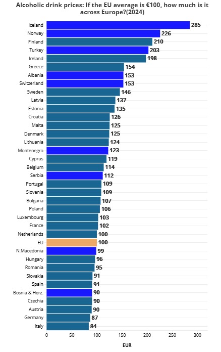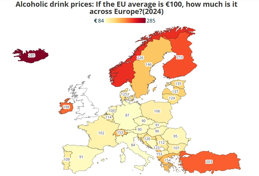 Conform datelor Eurostat, în medie, gospodăriile europene cheltuiesc 1,5 euro din fiecare 100 de euro pe băuturi alcoolice. Totuși, costul efectiv diferă considerabil de la o țară la alta. Indicele nivelului prețurilor pentru băuturi alcoolice compară prețul aceluiași coș de produse în 36 de state europene, iar media UE este stabilită la 100 de euro. Orice scor peste 100 indică prețuri mai mari decât media europeană.