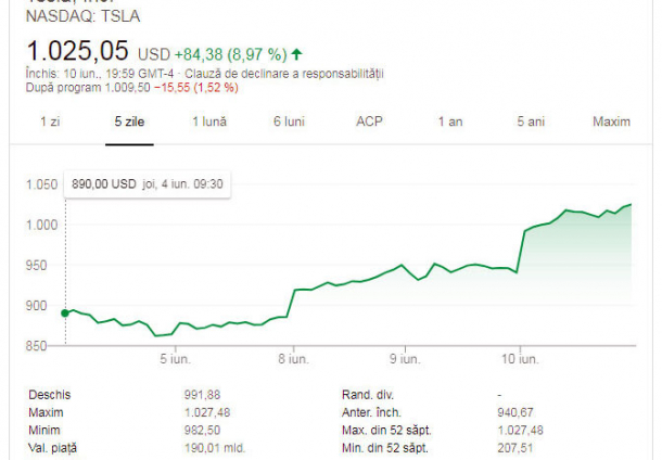 Plafonul de piață evaluat pentru Tesla se situează undeva la aproximativ 185 miliarde de dolari, mai mult decât General Motors, Ford și Fiat Chrysler Automobiles combinate, cotația sa ridicându-se la aproximativ 1.025 dolari pe acțiune, în continuă creștere.
