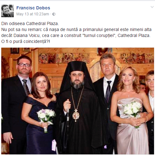 "Din odiseea Cathedral Plaza. Nu pot sa nu remarc că nașa de nuntă a primarului general este nimeni alta decât Daiana Voicu, cea care a construit "turnul corupției", Cathedral Plaza. O fi o pură coincidență?!", a scris prelatul.