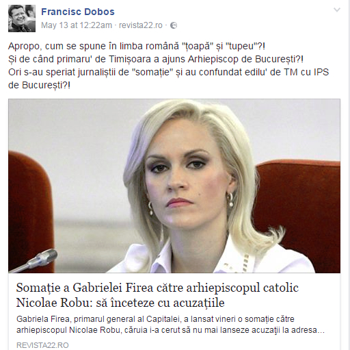 Doboș a avut un comentariu dur și după un articol în care Gabriela Firea îl somează pe arhiepiscopul Robu să înceteze cu acuzaţiile la adresa sa.