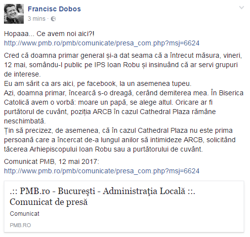 "Doresc să vă înaintez pe această cale un protest oficial față de conduita dlui Francisc Doboș, purtătorul de cuvânt al Arhiepiscopiei Romano-Catolice din București, care și-a permis să insinueze că aș servi, în calitate de Primar General, anumite grupuri de interese, nenominalizate, fără a aduce vreo dovadă în acest sens. Mai mult, în totală disonanță cu atitudinea pe care publicul se așteaptă s-o aibă un slujitor al Bisericii, dl. Doboș și-a permis chiar să folosească un limbaj trivial la adresa mea și să colporteze informații inexacte sau trunchiate despre mine, ceea ce este total inacceptabil", a transmis într-un comunicat de presă primarul general.