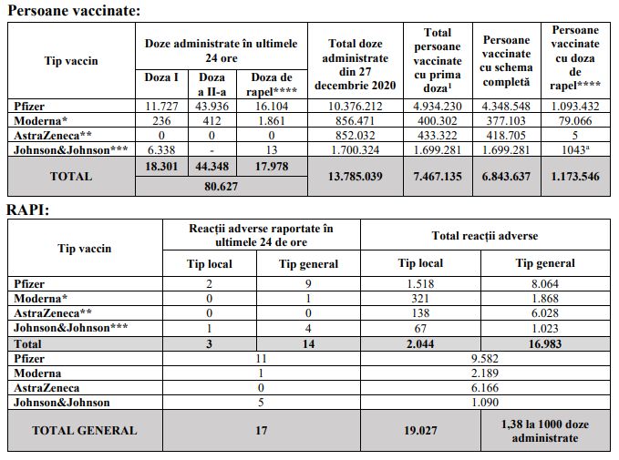 13.785.039 de doze au fost administrate în total și s-au înregistrat 19.027 de reacții adverse, adică 1,38 la mia de doze administrate. 200 sunt în curs de investigare.