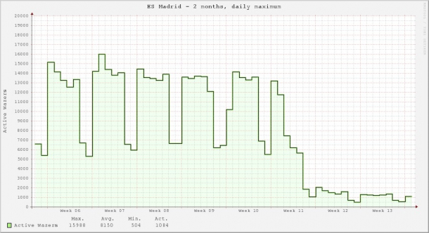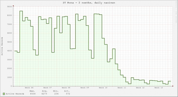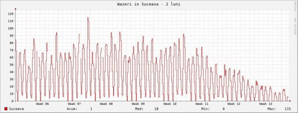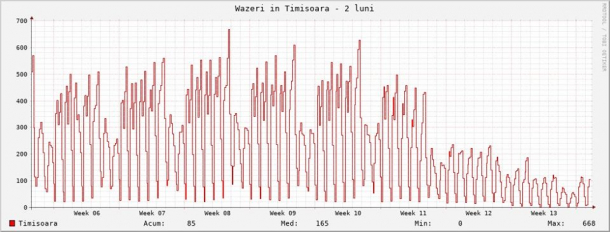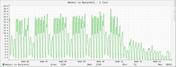 În București, de exemplu, procentul de scădere este de 82, de la 19.000 de utilizări simultane pe zi, la sub 3.500.