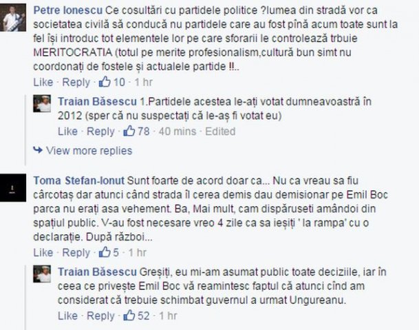 Răspunzând unui atac al unui “prieten virtual”, în care era acuzat că atunci când strada îi cerea demisa lui Emil Boc nu era așa vehement ca în aceste zile, fostul șef de stat reamintește faptul că Guvernul Boc a fost schimbat imediat cu Guvernul Ungureanu, Executiv ce a fost schimbat cu Guvernul Ponta în 2012, prin votul românilor.