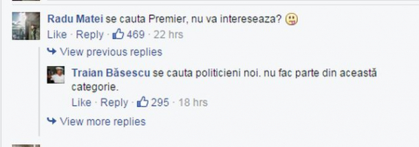 Fostul președinte Traian Băsescu a fost întrebat de un cetățean, pe Facebook, dacă ar fi interesat să preia funcția de premier.
