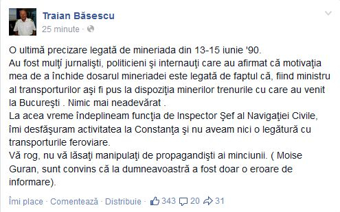 ”O ultimă precizare legată de mineriada din 13-15 iunie ’90. Au fost mulţí jurnalişti, politicieni şi internauţi care au afirmat că motivaţia mea de a închide dosarul mineriadei este legată de faptul că, fiind ministru al transporturilor aş fi pus la dispoziţia minerilor trenurile cu care au venit la Bucureşti. Nimic mai neadevărat”, scrie Traian Băsescu.