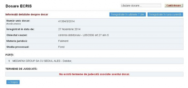 Trustul de presă deţinut de omul de afaceri Adrian Sârbu, Mediafax Group, şi-a cerut insolvenţa, potrivit unui anunț publicat pe site-ul Tribunalului Bucureşti.