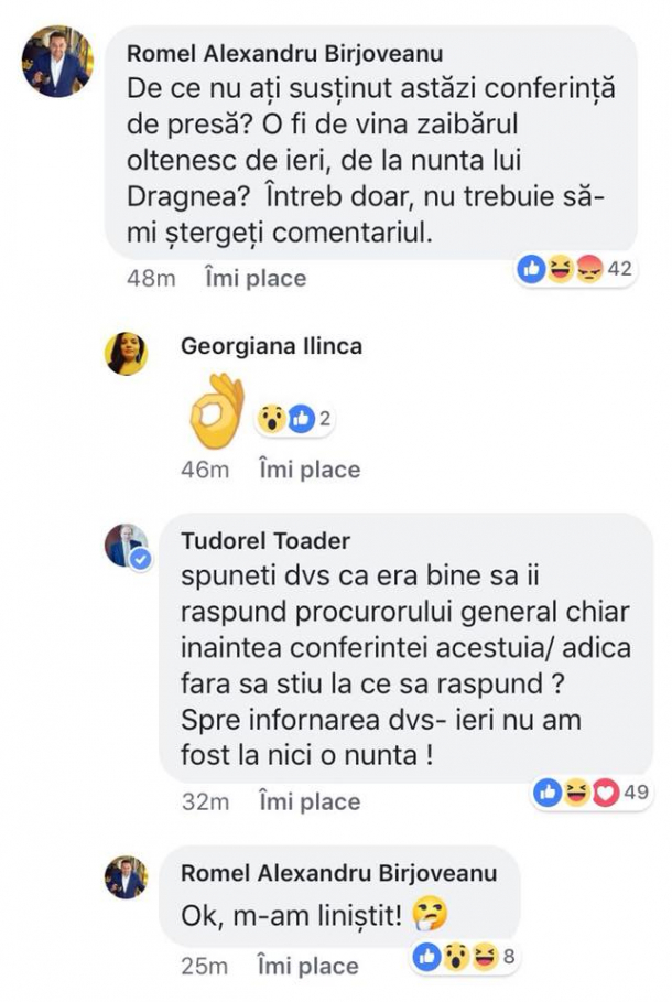 Un utilizator Facebook l-a întrebat pe Toader de ce nu a organizat luni o conferință pentru a-i răspunde procurorului general. Acesta s-a întrebat retoric dacă nu cumva motivul ține de alcoolul pe care l-a consumat ministrul la nunta lui Valentin Dragnea.