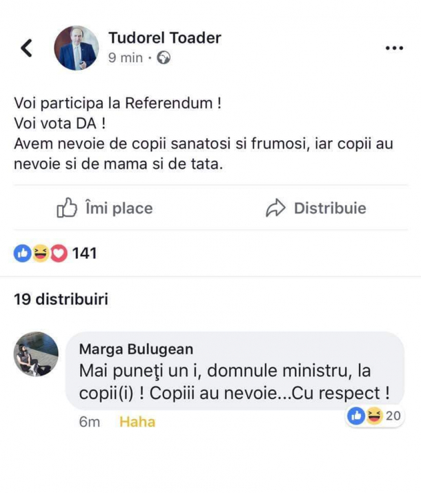 Astfel, ministrul a ”mâncat” un ”i”, declarând: ” Voi participa la Referendum ! Voi vota DA ! Avem nevoie de copii sanatosi si frumosi, iar COPII au nevoie si de mama si de tata.”