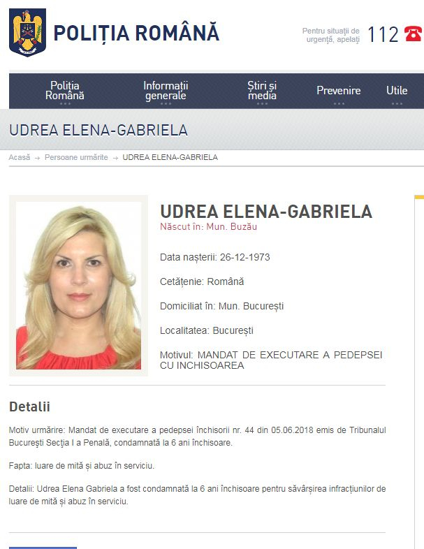 Poliţia Română a anunţat oficial faptul că Elena Udrea a fost dată în urmărire generală pentru punerea în executare a sentinţei primite în dosarul Gala Bute.