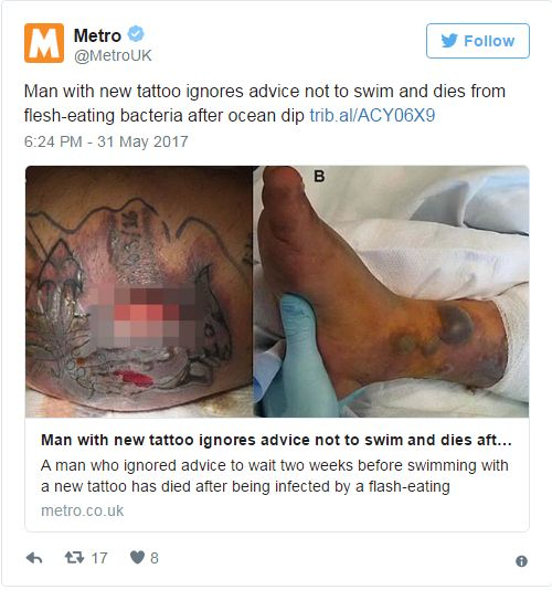 Un bărbat de 31 de ani a contacat o bacterie care se hrănea cu piele și țesut, în urma căruia a suferit o infecție. Se pare că el a mers să înoate în Golful Mexic la cinci zile după ce și-a făcut tatuajul, potrivitmetro.co.uk.