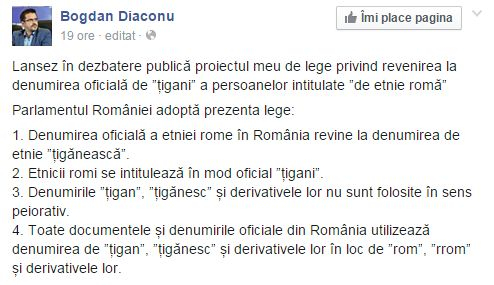 Liderul Partidului România Unită, deputatul Bogdan Diaconu, a prezentat pe pagina sa Facebook proiectul de lege prin care acesta cere revenirea la denumirea oficială de țigani a persoanelor intitulate ”de etnie romă”, după ce zilele trecute a lansat un sondaj de opinie pe rețeaua de socializare referitor la aceeași problemă.