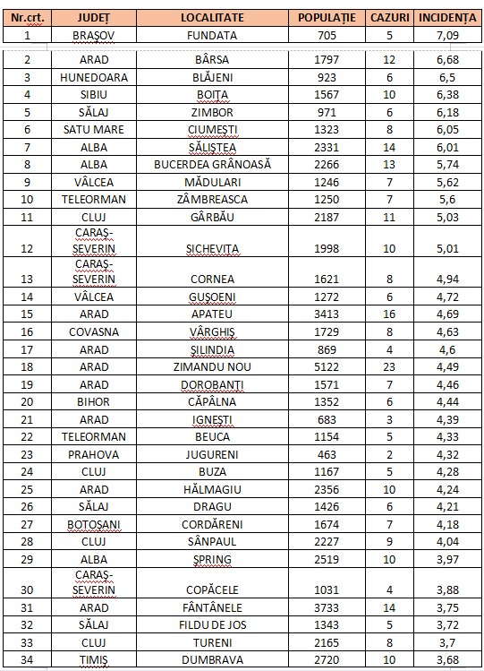 În ceea ce privește situația comunelor, pe lista roșie se află 55 de zone. Cea mai mare rata de incidență se înregistrează în Fundata, județul Brașov 7,09, Bârsa, județul Arad 6,68 și Blăjeni, județul Hunedoara cu 6.5.