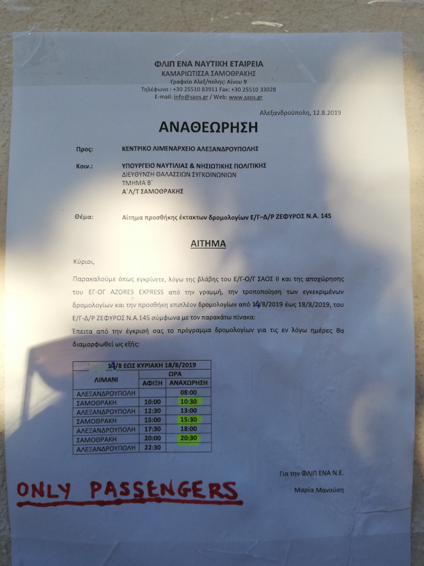 De asemenea, sursele B1.ro au precizat că autoritățile din insulă au anunțat, printr-un afiș în limba greacă, pus în port, că miercuri, feribotul va prelua doar turiști, fără mașinile acestora.