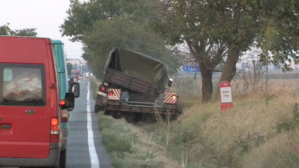 Șoferul autotrailerului de armată a încercat să evite impactul cu un TIR al cărui șofer efectuase o depășire imprudentă. Incidentul s-a produs pe DN2B, la 7 kilometri distanță de municipiul Buzău.