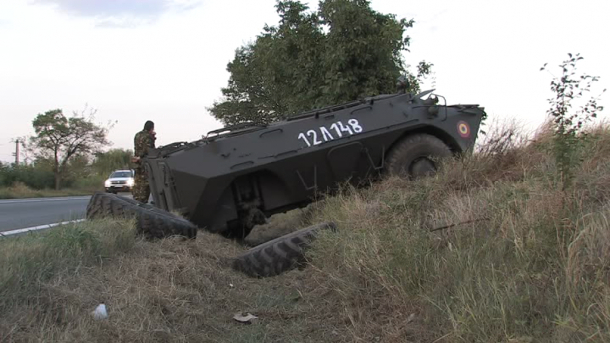 Un TAB transportat de un camion militar a ajuns direct în șanț după ce mastodontul a ieșit în afara părții carosabile, iar transportorul blindat s-a desprins din ancore și a căzut de pe platforma autotrailerului.