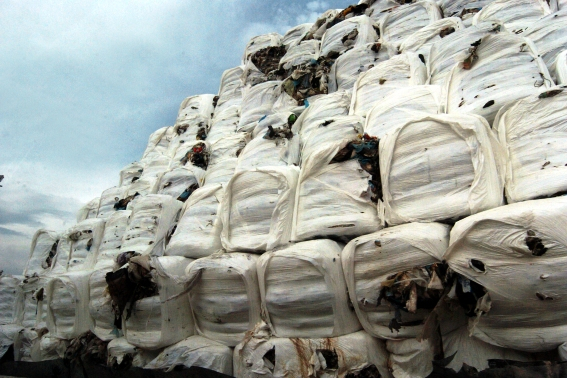 Acestea sunt așa numite eco-baloturi, care au fost stocate, formând piramide de 10-12 metri, acoperite de plasă din plastic.