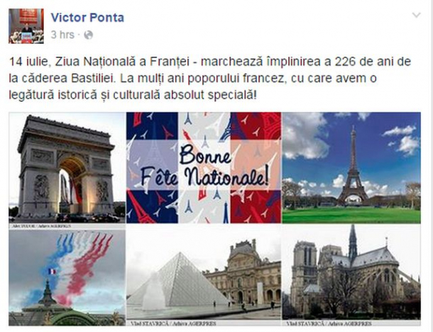 „14 iulie, Ziua Națională a Franței – marchează împlinirea a 226 de ani de la căderea Bastiliei. La mulți ani poporului francez, cu care avem o legătură istorică și culturală absolut specială!”, scrie Ponta.