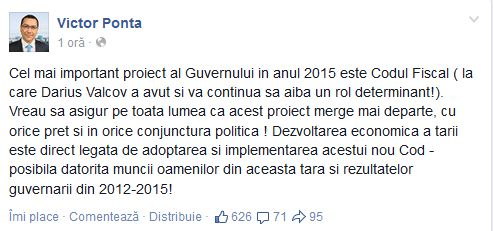 ”Cel mai important proiect al Guvernului în anul 2015 este Codul Fiscal (la care Darius Vâlcov a avut și va continua să aiba un rol determinant!). Vreau să asigur pe toată lumea că acest proiect merge mai departe, cu orice preț și în orice conjunctura politică! Dezvoltarea economică a țării este direct legată de adoptarea și implementarea acestui nou Cod – posibilă datorită muncii oamenilor din această țara și rezultatelor guvernării din 2012-2015!”, a notat Victor Ponta.