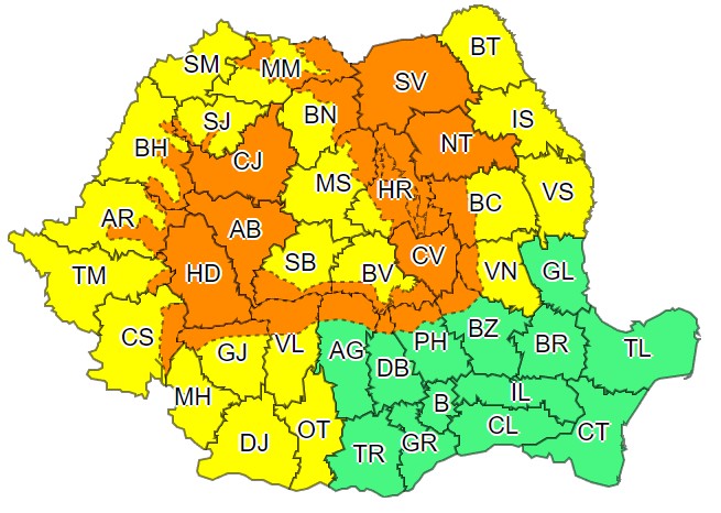 De asemenea, până luni este în vigoare un cod portocaliu pentru zonele montane, vestul Transilvaniei și nord-vestul Moldovei. În aceste regiuni, se vor înregistra perioade cu averse ce vor avea caracter torențial, însoțite de frecvente descărcări electrice. Vântul va sufla cu intensitate crescută, atingând rafale de peste 80 km/h, iar fenomenele de vijelii și grindină pot apărea. Cantitățile de apă vor fi semnificative, cu valori între 30…40 l/mp, iar în unele zone pot depăși izolat 50…60 l/mp, pe intervale scurte de timp (1-3 ore) sau prin acumulare.